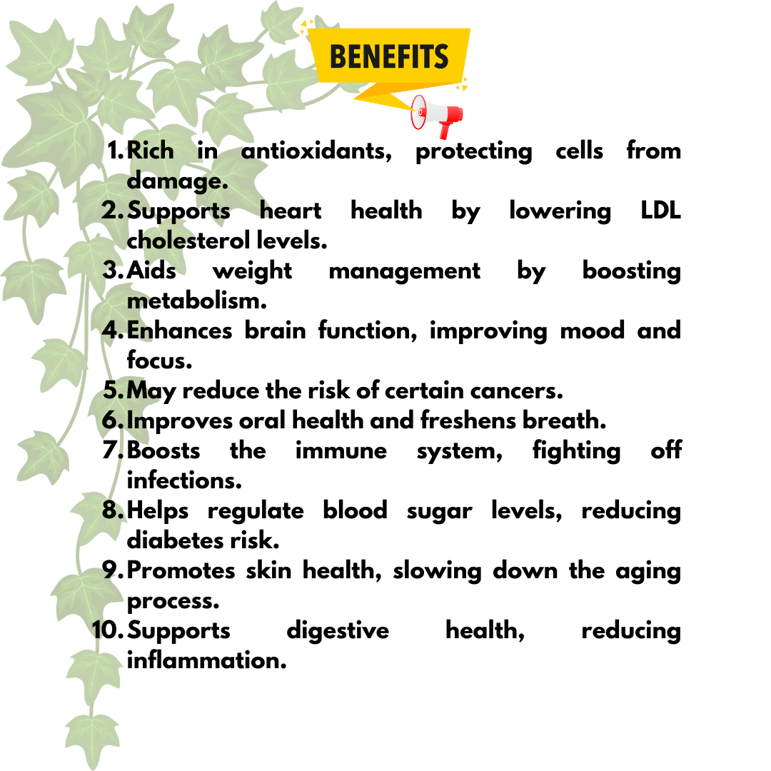 Supports overall health with potent antioxidants Metabolism Boost: May aid in weight management by enhancing metabolism Anti-Inflammatory: Helps reduce inflammation with its natural compounds Our Green Tea comes in a secure, resealable pouch to maintain freshness, flavor, and extend the shelf life of the product.Share