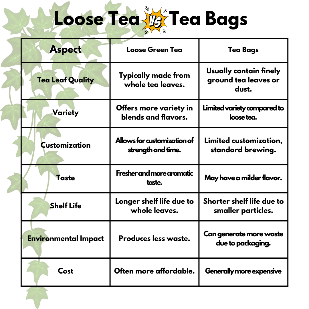 Variety: Loose tea offers a diverse range of options including single-origin teas, blends, and flavors, allowing for exploration and enjoyment of a wider tea selection.